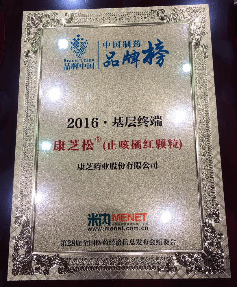11月24日,“2016中國制藥?品牌榜”在第28屆全國醫藥經濟信息發布會上揭曉,康芝藥業旗下明星產品康芝松?(止咳橘紅顆粒)成功入選基層終端品牌榜榜單。康芝藥業市場醫學部總監劉湛先生受邀出席頒獎典禮并受領獎牌。