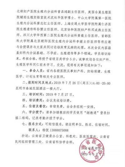 云南省醫師協會關于計劃生育醫師分會舉辦2019年海峽兩岸生殖醫學與內分泌學術研討會學習班的通知