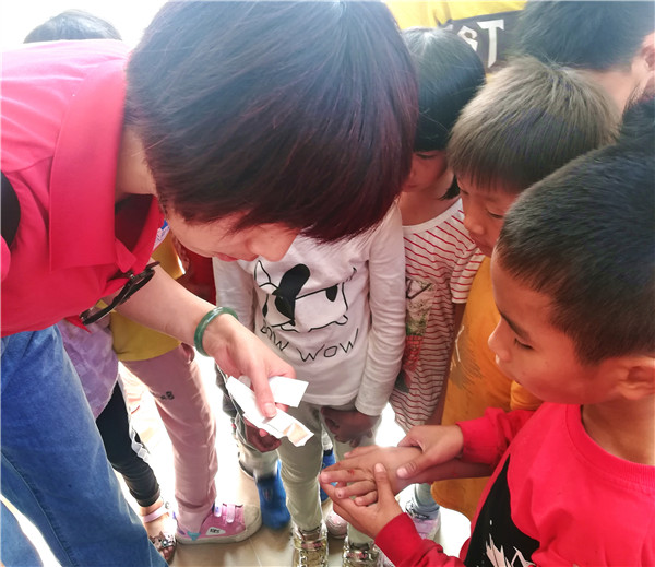 孩子們及家長們在領取到藥箱后難掩喜悅之情,迫不及待打開藥箱細看。當天,一名學生意外弄傷手指,在場志愿者使用愛心藥箱的藥品及用品,耐心為其消毒并包上創可貼。