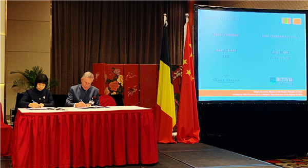 △康芝藥業副董事長兼副總裁洪麗萍(左)與Vésale Pharma公司董事長Jehan Lienart(右)簽署協議