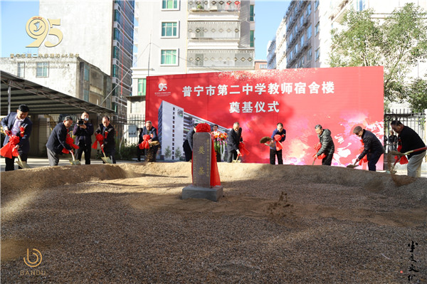 上午8時(shí)40分,教師宿舍樓工程奠基儀式開始,參加儀式的主禮嘉賓為奠基石培土壯基。