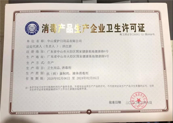 在此次應急項目上,愛護能在極短的時間內,迅速完成消毒水生產的申報資料并順利通過,獲得《消毒產品生產企業衛生許可證》,得力于愛護擁有非常完善的生產管理體系,以及強大的配方儲備支持。