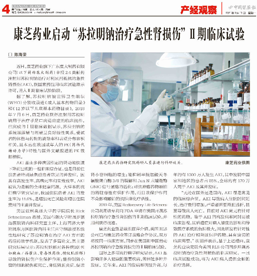 康芝藥業(yè)副董事長(zhǎng)洪麗萍介紹,目前,美國(guó)RLS公司已與康芝藥業(yè)簽訂戰(zhàn)略合作協(xié)議,雙方按同一臨床方案,同步在美國(guó)和中國(guó)啟動(dòng)蘇拉明鈉治療急性腎損傷的II期臨床試驗(yàn)。