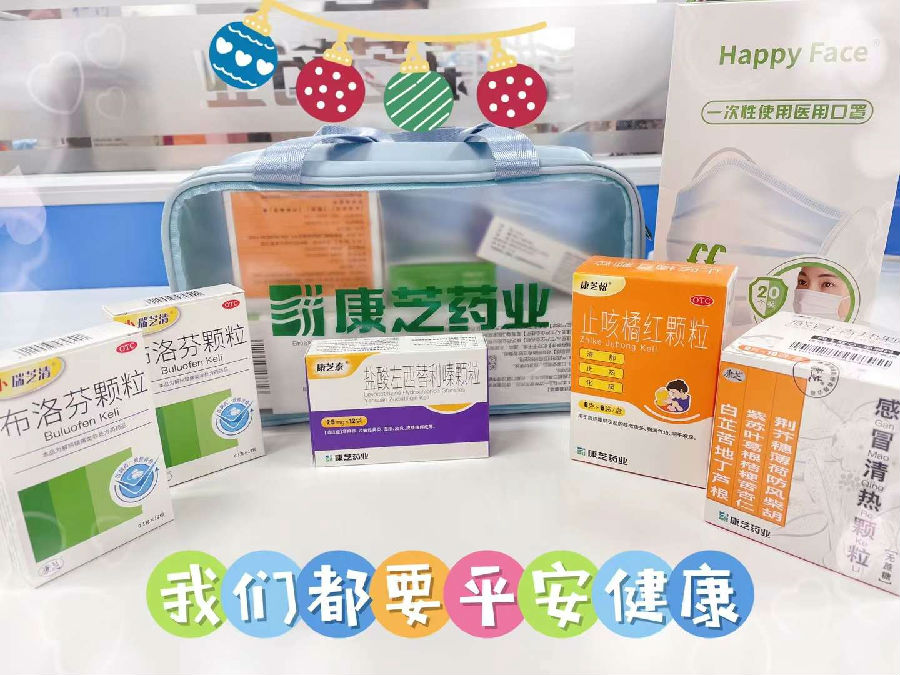 康芝防疫愛心包內(nèi)含:一次性使用醫(yī)用口罩、布洛芬顆粒、感冒清熱顆粒、鹽酸左西替利嗪顆粒、止咳橘紅顆粒等常用藥品和防護(hù)物資。