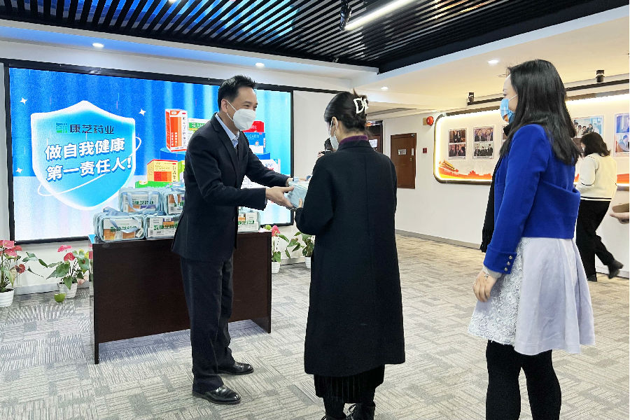 康芝藥業(yè)總裁洪江濤將準(zhǔn)備好的防疫包逐一發(fā)放到仍堅守工作崗位的員工手中,親切地叮囑大家提高疫情防控意識、做好個人防護(hù),并祝愿大家平安健康。