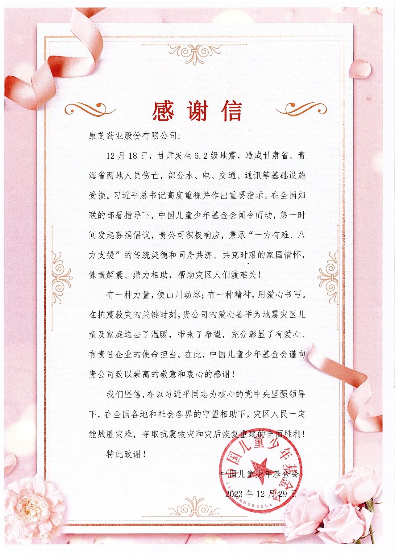 近日,臨夏回族自治州人民政府、中國共產黨臨夏回族自治州委員會以及中國兒童少年基金會向康芝藥業股份有限公司發來《致康芝藥業感謝信》,紛紛對康芝藥業積極參與甘肅臨夏積石山縣地震救災的緊急援助工作表示高度贊揚與衷心感謝。