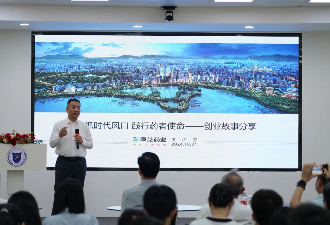 捐贈儀式后,“康芝多媒體廳”迎來首場活動——第十期創新創業下午茶主題講座。洪江游董事長作為分享嘉賓,以“緊抓時代風口 踐行藥者使命”為主題,圍繞“我的大健康情結”“三十余載深耕大健康的創業之路”分享了自己堅定大健康事業初心、錨定創業目標、順應時代浪潮、抓準機遇積極投身于健康發展的創業故事。