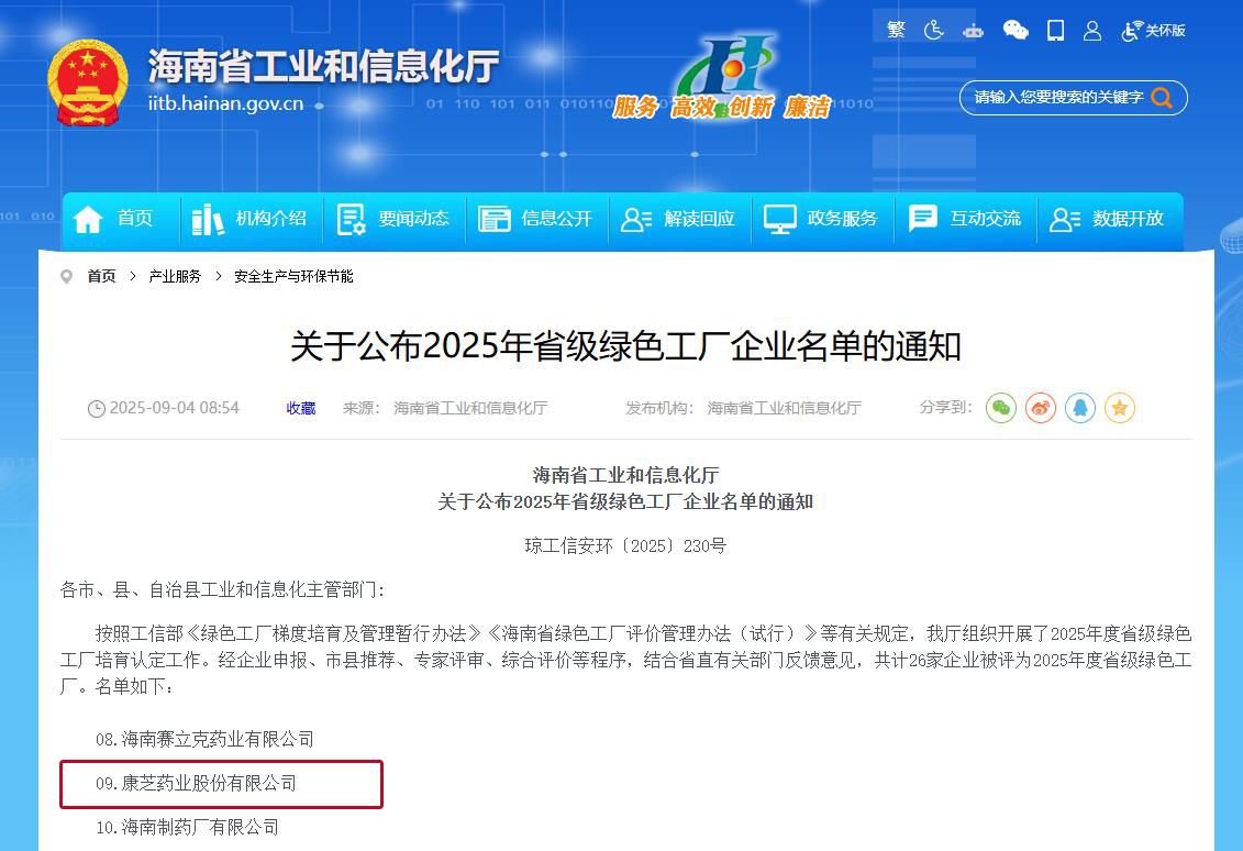 經(jīng)企業(yè)申報(bào)、市縣推薦、專家評審、綜合評價(jià)等程序,結(jié)合省直有關(guān)部門意見,9月3日,海南省工業(yè)和信息化廳正式公布了2025年省級綠色工廠企業(yè)名單。其中,康芝藥業(yè)成功被評為“2025年度省級綠色工廠”,充分體現(xiàn)了政府有關(guān)部門對公司綠色生產(chǎn)和可持續(xù)發(fā)展成果的認(rèn)可。