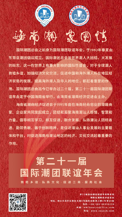 第21屆國際潮團(tuán)聯(lián)誼年會將于12月3日至12月5日在博鰲亞洲論壇國際會議中心召開,本屆年會也是繼汕頭、北京、廣州、武漢之后第五次在中國內(nèi)地召開、首次在海南召開。